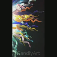 Round shape modern design colorful custom blown glass chandeliers.The unique shape, like a sword shooting outwards, and the rich and colorful color combinations of deep and light blue, lake green, amber, orange, etc., are like rolling lightning, displaying a brilliant and dazzling light in the darkness.More than 100 glass combinations of different colors give it an unparalleled sense of visual hierarchy and richness. Each piece of glass seems to be telling its own story, interweaving together into a colorful picture.