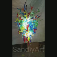 Colorful custom italian hand blown glass chandelier mixed flowers.This chandelier is colorful and has elements such as morning glory, seaweed, and ox horns. It has a unique shape and is extremely unique. It is made of colored glass, which never fades, has a thick texture, and is of high quality. The entire chandelier shows a lively, colorful and charming charm that is pleasing to the eye.