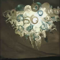 White transparent plus some smoky blue, a very stylish chandelier. If you are tired of the traditional machine assembly line chandeliers, then take a look at this chandelier made of pure handmade glass. The color and specifications are all customized. Open your imagination and let me create a unique lighting for you. Looking forward to your information.