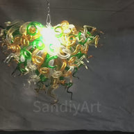 The combination of gold and green is so beautiful. It has both the freshness of nature and the luxury of wealth. The extreme combination of two different meanings presents an amazing effect. Gold and green, is this the combination you are looking for? Is it just what you want? Choose it and let this lamp amaze your space.Green and maber hand made murano glass ceiling light.