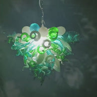 Green color DIY hand blown glass chandelier dining room decoration.This chandelier cleverly combines green, sky blue and white glass to form a unique and harmonious color combination. Green represents nature and vitality, sky blue symbolizes tranquility and freshness, and white adds a sense of purity and elegance. The curved glass tube bubble ball adds a sense of fun and art to the chandelier. The handmade feature makes each chandelier unique. It can bring a unique decorative effect to the space, creating a warm, romantic or artistic atmosphere. Whether it is a modern minimalist style or a retro style space, this chandelier can complement it and become a highlight in the space.