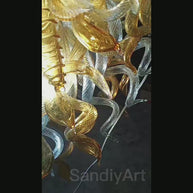 Luxury gold mouth blown glass chandelier chihuly art decoration.This is undoubtedly a luxurious and gorgeous chandelier, with dazzling golden light that is stunning at first sight. It is mixed with some transparent glass, which just blends the gold color and makes it more elegant. This chandelier is very suitable for decoration in villas, hotels, exhibition halls and other important occasions, and can instantly enhance the style and taste of the space.
