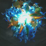 The sky-blue glass curved tube is the main feature, matched with the lively green seaweed and the golden colorful water trumpet flower, which has become the focus of the entire chandelier. Its unique color and shape exude a sense of metal technology. The entire chandelier is combined together to form a very distinctive visual impact. Whether it is placed in a modern space or integrated with other styles, it can instantly enhance the style and atmosphere of the environment.